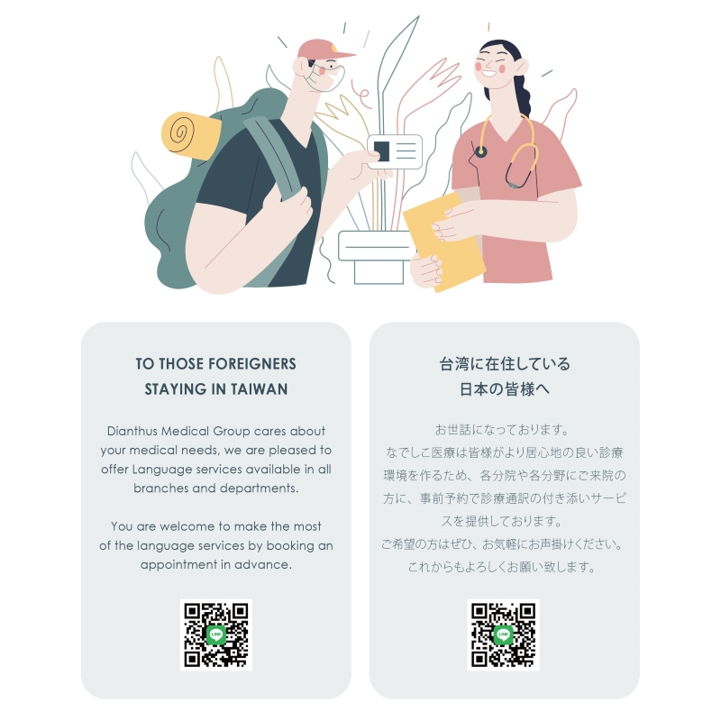 這樣小細節大不同的英語/日語口譯貼心服務,只要有需求便可以透過專屬的LINE洽詢,亦可在掛號時請行政協助預約安排,不限院區與科別皆能提供服務,大大拉近不同語言的距離,希望能幫助每一位來診者,擁有更良好的溝通與優質的醫療體驗。