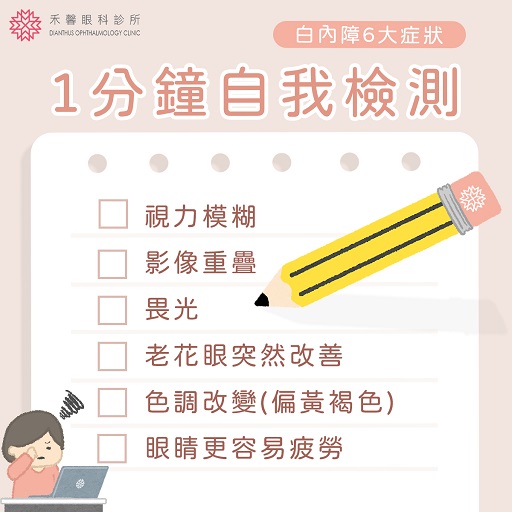 【禾馨小漫畫.白內障–1分鐘自我檢測】 白內障不再只是銀髮族的專利?! 現代3C產品的普及與過度使用 讓白內障罹患年齡下降了! 簡單的1分鐘自我檢測,列出白內障6大症狀 幫助大家評估自身眼睛健康~ 愛護眼睛=提早預防+及時治療 + 定期檢查 若有符合以下幾個症狀 建議就診由專業醫師進一步檢查診斷喔!