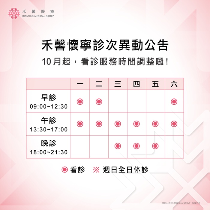 自2025/10/01起 禾馨懷寧門診時間調整異動如下 繼續為個案提供優質的診療服務 ◉星期一 ▶ 早診/午診 ◉星期二 ▶ 早診/午診 ◉星期三 ▶ 午診/晚診 ◉星期四 ▶ 午診/晚診 ◉星期五 ▶ 午診/晚診 ◉星期六 ▶ 早診/午診 ◉星期日 ▶ 全日休診
